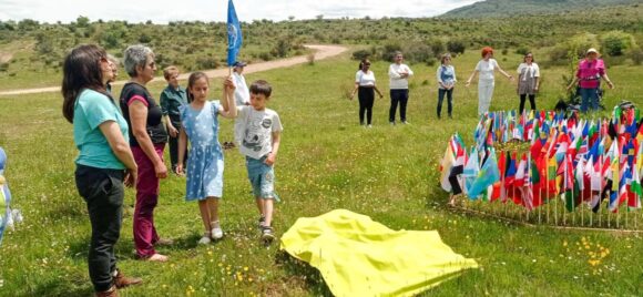 The ceremony took place in a space familiar to us, in a field near a Romane church, and under the protection of a peace pole, the first planted in Spain, long ago. To help us get into the consciousness of the Symphony of Peace Prayers, we always begin with a meditative walk, in silence, on a two kilometer trail, where we stop along the way for a short moment to honor the continents (each continent is represented by a large colored flag). A spring sun and a field of flowers enveloped us throughout our walk.